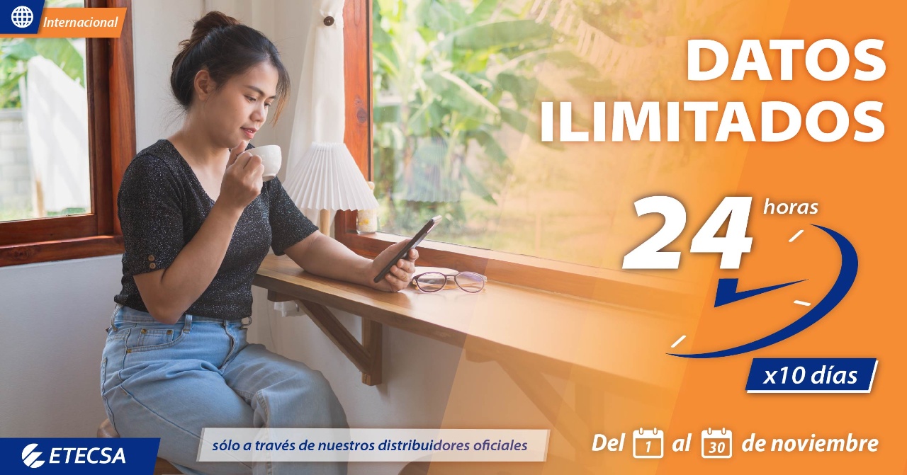 The Cuban Telecommunications Company S.A. (ETECSA) announces that customers of our international distributors who top up between 500 CUP and 1,250 CUP will have the opportunity to enjoy Unlimited Data 24 hours a day, valid for 10 days.