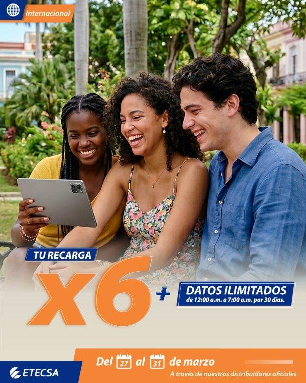La Empresa de Telecomunicaciones de Cuba S.A. (ETECSA) anuncia que desde el 27 de marzo hasta el 31 de marzo, los clientes que reciban una recarga internacional entre 600 CUP y 1250 CUP a través de nuestros distribuidores oficiales multiplicarán la cantidad recargada por 6 en su saldo principal y recibirán datos ilimitados para navegar de 12:00 a.m. a 7:00 a.m. durante 30 días.